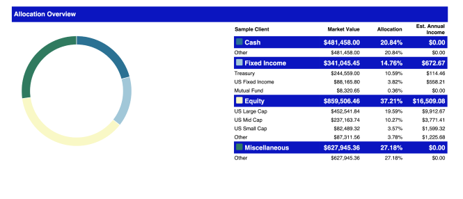 Household Dashboard. Reporting. Unusual Activity. Once the financial plan is created, the wealth manager will work with the client to implement the plan. This may involve opening investment accounts, selecting specific investments, and making changes to the client's current financial holdings.